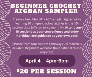 Join us for a fun and beginner-friendly crochet journey as you create a beautiful 50″ x 60″ sampler afghan from start to finish! In this class, you’ll learn 30 different crochet stitches over 15 sessions, building your skills one square at a time. Each class introduces new stitches and techniques while helping you grow more confident with your crochet skills.