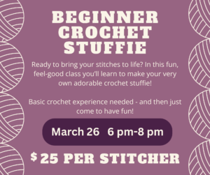 Join us for a cozy and creative Beginner Crochet Stuffy Making Class, where yarn, imagination, and community come together. In this hands-on workshop, you’ll learn how to transform simple stitches into an adorable handmade stuffie you can proudly take home. We’ll walk through the basics of shaping, increasing and decreasing, stuffing, and finishing techniques, all in a supportive, encouraging environment. Participants should be comfortable with basic crocheting. More than just a class, this is a space to gather, connect, and create alongside fellow makers. Whether you come with a friend or arrive solo, you’ll leave not only with a sweet handmade stuffie, but with new skills, new confidence, and new connections within our creative community.