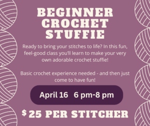 Join us for a cozy and creative Beginner Crochet Stuffy Making Class, where yarn, imagination, and community come together. In this hands-on workshop, you’ll learn how to transform simple stitches into an adorable handmade stuffie you can proudly take home. We’ll walk through the basics of shaping, increasing and decreasing, stuffing, and finishing techniques, all in a supportive, encouraging environment. Participants should be comfortable with basic crocheting. More than just a class, this is a space to gather, connect, and create alongside fellow makers. Whether you come with a friend or arrive solo, you’ll leave not only with a sweet handmade stuffie, but with new skills, new confidence, and new connections within our creative community.