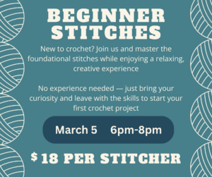 Join us for a cozy, beginner-focused crochet class designed for those who have never picked up a hook before. We’ll cover the absolute basics—how to hold your hook and yarn, create a slip knot, and learn foundational stitches like chain and single crochet—while you start your very first project. More than just a class, this is a space to gather, connect, and create together. Come for the skills, stay for the community.