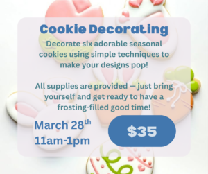 Get ready for a sweet and creative experience at our Cookie Decorating Class! In this fun, hands-on workshop, you’ll decorate six adorable seasonal cookies using royal icing while learning simple techniques to make your designs pop. No experience? No problem! This class is perfect for beginners and seasoned bakers alike. You will be guided step-by-step through outlining, flooding, and adding decorative details so you can leave with beautifully finished cookies you’ll be proud to show off (or enjoy at home!). All supplies are provided — just bring yourself and get ready to have a frosting-filled good time!