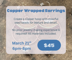 In this beginner-friendly class, students will form a simple copper hoop, wrap it securely, and weave in colorful seed beads for texture and detail. No prior jewelry-making experience is required! All materials included