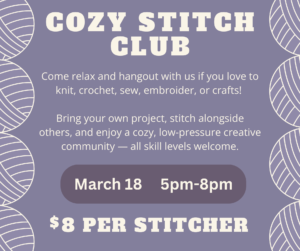 Cozy Stitch Club is a relaxed, welcoming hangout for anyone who loves crafting with their hands. Whether you crochet, knit, hand sew, embroider—or dabble in something else entirely—you’re invited to bring your own project and enjoy a cozy time stitching alongside others. This isn’t a class, just a low-pressure creative gathering. Come to make progress on a project, get help from fellow stitchers, get inspired by what others are working on, or simply enjoy the company and conversation. All skill levels are welcome.