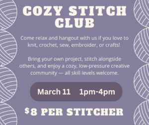 Cozy Stitch Club is a relaxed, welcoming hangout for anyone who loves crafting with their hands. Whether you crochet, knit, hand sew, embroider—or dabble in something else entirely—you’re invited to bring your own project and enjoy a cozy time stitching alongside others. This isn’t a class, just a low-pressure creative gathering. Come to make progress on a project, get help from fellow stitchers, get inspired by what others are working on, or simply enjoy the company and conversation. All skill levels are welcome.