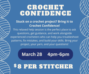 Got a crochet project that’s stuck, confusing, or just not turning out the way you hoped? Crochet Confidence is the perfect place to bring it in and get the help you need. This supportive, come-as-you-are session is designed for crocheters who want guidance, troubleshooting, and encouragement while working on their own projects. Whether you’re struggling with a pattern, trying to fix a mistake, learning a new stitch, or just need a little reassurance that you’re doing it right, experienced crocheters will be there to help answer questions and walk you through it. You’ll also enjoy the company of fellow makers who understand the joy (and occasional frustration) of yarn projects. Bring your work-in-progress, your questions, and your yarn — and leave feeling more confident in your crochet skills.