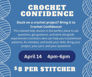 Got a crochet project that’s stuck, confusing, or just not turning out the way you hoped? Crochet Confidence is the perfect place to bring it in and get the help you need. This supportive, come-as-you-are session is designed for crocheters who want guidance, troubleshooting, and encouragement while working on their own projects. Whether you’re struggling with a pattern, trying to fix a mistake, learning a new stitch, or just need a little reassurance that you’re doing it right, experienced crocheters will be there to help answer questions and walk you through it. You’ll also enjoy the company of fellow makers who understand the joy (and occasional frustration) of yarn projects. Bring your work-in-progress, your questions, and your yarn — and leave feeling more confident in your crochet skills.