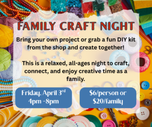 Family Craft Night is an open, creative evening for kids and adults to make together—or work on their own projects side by side. This open craft time is designed to be relaxed and flexible, so families can drop in, take breaks, and enjoy creating at their own pace. Participants are welcome to bring their own projects from home or choose from a selection of curated craft kits available for purchase and designed by one of our instructors. Whether you’re painting, stitching, building, or trying something new, this is a space to connect, create, and spend meaningful time together. All ages and skill levels are welcome.