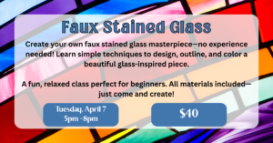 Create the look of luminous stained glass — no soldering required! In this hands-on faux stained glass workshop, you’ll design and complete your own beautiful artwork using a precision laser-cut wooden outline that mimics traditional stained glass leading, making it easy to achieve clean lines and a stunning segmented design. You’ll learn how to work with broken glass to fill your piece, combining classic stained glass aesthetics with modern techniques in a way that’s approachable and fun for all skill levels. Whether you’re a beginner or an experienced maker, you’ll enjoy the creative process and leave with a gorgeous, ready-to-display piece that glows beautifully in natural light. All materials are provided — just bring your creativity and come ready to create!
