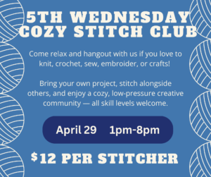 Whenever the month gives us a fifth Wednesday, we’ll celebrate with an extended Cozy Stitch Club from 1pm–8pm—a special all-day stitching hangout so you can drop in when it works for you and enjoy even more creative community time. Cozy Stitch Club is a relaxed, welcoming hangout for anyone who loves creating with their hands. Whether you crochet, knit, hand sew, embroider—or dabble in something else entirely—you’re invited to bring your own project and enjoy cozy creative time alongside others. This isn’t a class, just a low-pressure gathering where you can make progress on a project, get tips or encouragement from fellow stitchers, find inspiration in what others are making, or simply enjoy good company and conversation. All skill levels are welcome.