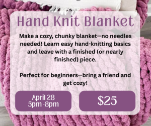Wrap yourself in creativity and comfort in this cozy, beginner-friendly hand knit blanket workshop! In this class, you’ll learn how to create a soft, chunky blanket using only your hands — no knitting needles required. We’ll walk step-by-step through the basics, including casting on, creating hand-knit stitches, and binding off. This class is perfect for beginners, but also fun for anyone who wants to try a new creative technique. By the end, you’ll leave with a finished (or nearly finished) blanket and the skills and confidence to keep hand knitting on your own. Using luxurious, oversized yarn, you’ll create a beautiful blanket that adds warmth and style to any space — perfect for your home or as a heartfelt handmade gift. It’s a relaxed, welcoming environment, so bring a friend and enjoy a cozy time creating together!