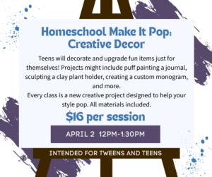 Ready to level up your style? In Make It Pop, teens will transform everyday items into bold, personalized creations using fun and trendy crafting techniques. Each class features a different project designed to help you decorate and upgrade something just for you. One session might have you puff painting the cover of a journal, another could involve sculpting a unique clay plant holder, or designing a custom monogram piece for your wall. Along the way, you’ll experiment with different materials, textures, and design ideas while learning creative techniques that make your projects stand out.