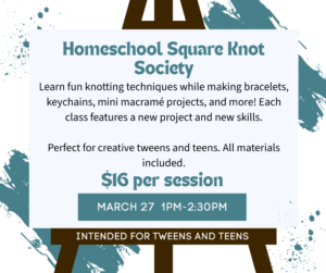 This class is perfect for homeschool tweens and teens who enjoy hands-on crafting, working with color and texture, and creating items they can wear, gift, or decorate their space with. Step-by-step instruction and individual guidance help each student build confidence as they learn new techniques. Because every session features a different project and new knotting skills, students can attend regularly and continue expanding their creative abilities.