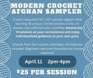 Join us for a creative and cozy journey in our Modern Crochet Afghan Sampler class! Over the course of 10 sessions (offered twice a month), you’ll create a stunning 50” x 60” sampler afghan while learning 30 beautiful crochet stitches that range from classic textures to modern designs. This class is designed for those who have a few crochet projects under their belt. Attend any 10 sessions that work for your schedule, and receive individualized guidance each time so you can move confidently through your pattern at your own pace. You’ll choose from four thoughtfully curated, customizable colorway options to make your afghan uniquely yours. All materials are included with your registration, so you can simply show up ready to stitch. Need extra support between sessions? You’re welcome to attend Cozy Stitch Club for additional help and encouragement along the way. By the end of this series, you’ll walk away with a gorgeous heirloom-quality afghan and a strong understanding of 30 stitches you can use in countless future projects.