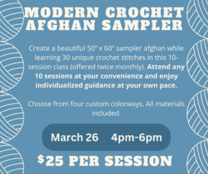 Join us for a creative and cozy journey in our Modern Crochet Afghan Sampler class! Over the course of 10 sessions (offered twice a month), you’ll create a stunning 50” x 60” sampler afghan while learning 30 beautiful crochet stitches that range from classic textures to modern designs. This class is designed to meet you exactly where you are — attend any 10 sessions that work for your schedule, and receive individualized guidance each time so you can move confidently through your pattern at your own pace. You’ll choose from four thoughtfully curated, customizable colorway options to make your afghan uniquely yours. All materials are included with your registration, so you can simply show up ready to stitch. Need extra support between sessions? You’re welcome to attend Cozy Stitch Club for additional help and encouragement along the way. No crochet experience? You’re absolutely welcome! Beginners will just need to complete two additional foundational classes before jumping into the sampler so you feel comfortable with the basics. By the end of this series, you’ll walk away with a gorgeous heirloom-quality afghan and a strong understanding of 30 stitches you can use in countless future projects.
