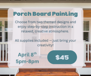 Join us for a fun and creative Porch Board Painting Class! In this hands-on workshop, you’ll design and paint your very own porch sign — the perfect statement piece for your front entrance or patio. You’ll receive step-by-step instruction from an experienced instructor, making it easy and enjoyable whether you’re a beginner or have some painting experience. There will be two theme-related designs to choose from on the day of class, and all materials are included — your porch board, paints, brushes, stencils, and tools. The atmosphere will be friendly and relaxed, so no experience is needed. Just bring your creativity (and wear something you don’t mind getting a little paint on)! In 2–3 hours, you’ll leave with a beautifully hand-painted porch board you’ll be proud to display or gift